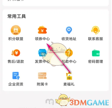 2。进入个人中心界面,点击常用工具中的优惠券中心图标。